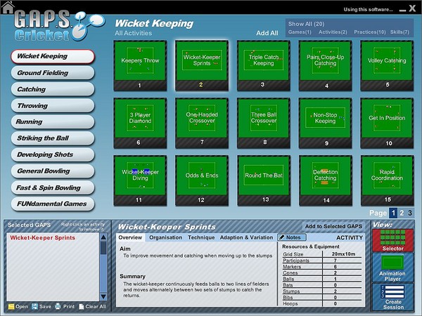 - The Activity Selector provides access to the content via 10 sub categories that cover the key elements of the game. Selecting one category (e.g. Catching) will load the relevant G.A.P.S. as thumbnails in the index. A search can be narrowed by filtering the index by Games, Activities, Practices or Skills.