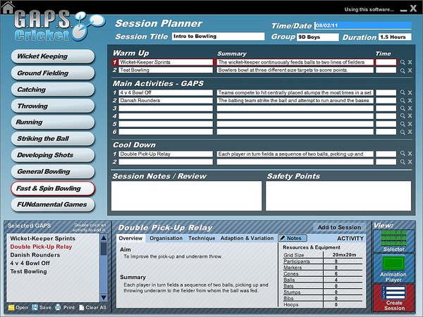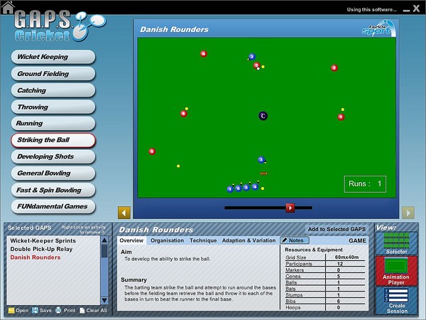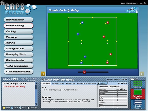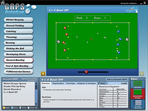 G.A.P.S. Cricket teaching/coaching software covers: