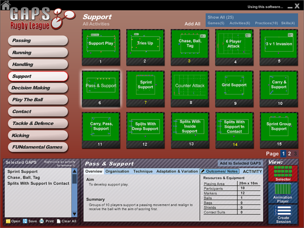 - The Activity Selector provides access to the content via 10 sub categories that cover the key elements of the game. Selecting one category (e.g. Passing ) will load the relevant G.A.P.S. as thumbnails in the index. A search can be narrowed by filtering the index by Games, Activities, Practices or Skills.
