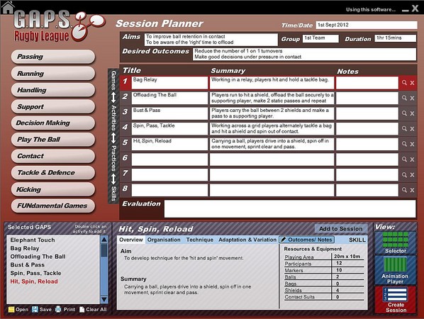 - G.A.P.S. Rugby League contains 250 Games, Activities, Practices & Skills covering: Passing, Running, Handling, Support, Decision Making, Play the Ball, Contact, Tackle & Defence, Kicking and Fun & Games.
